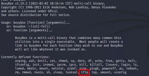 _toolsin the/tmpdirectory - TFTP the default BusyBox binary to the router with the steps below: