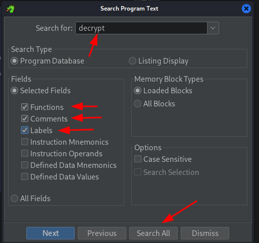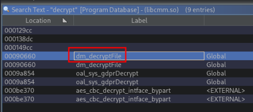 My first step to this process was pretty elementary and hack-y. Running a quick Program Text search for “decrypt” to find a possible label or function in the shared object that could lead me down the right path.