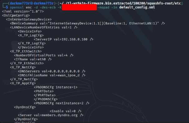 openssl enc -d -des-ecb -K <redacted> -nopad -in default_config.xml